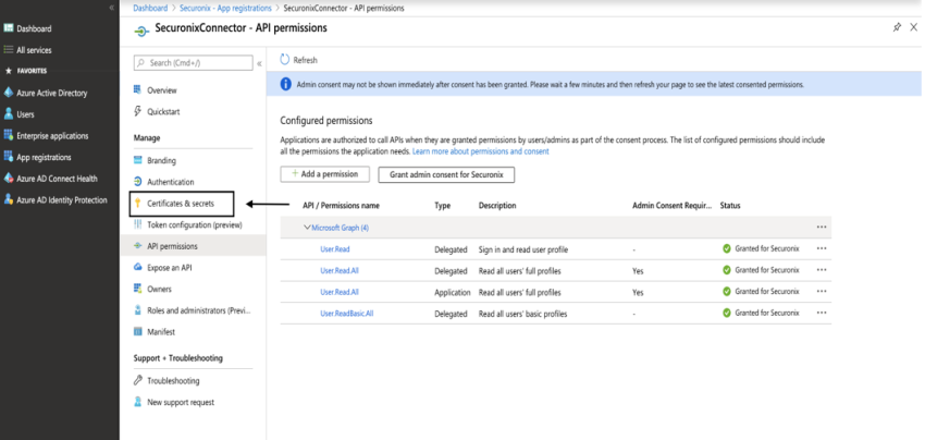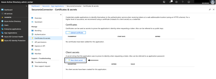 - Click the copy icon beside the Value of client secret to copy to clipboard. This value will not be retrievable once you leave this page.