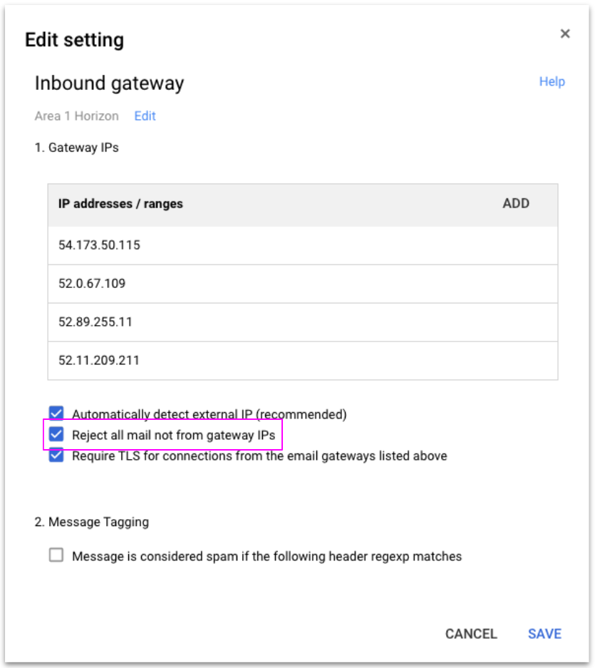 - Enable Reject all mail not from gateway IPs and select Save.