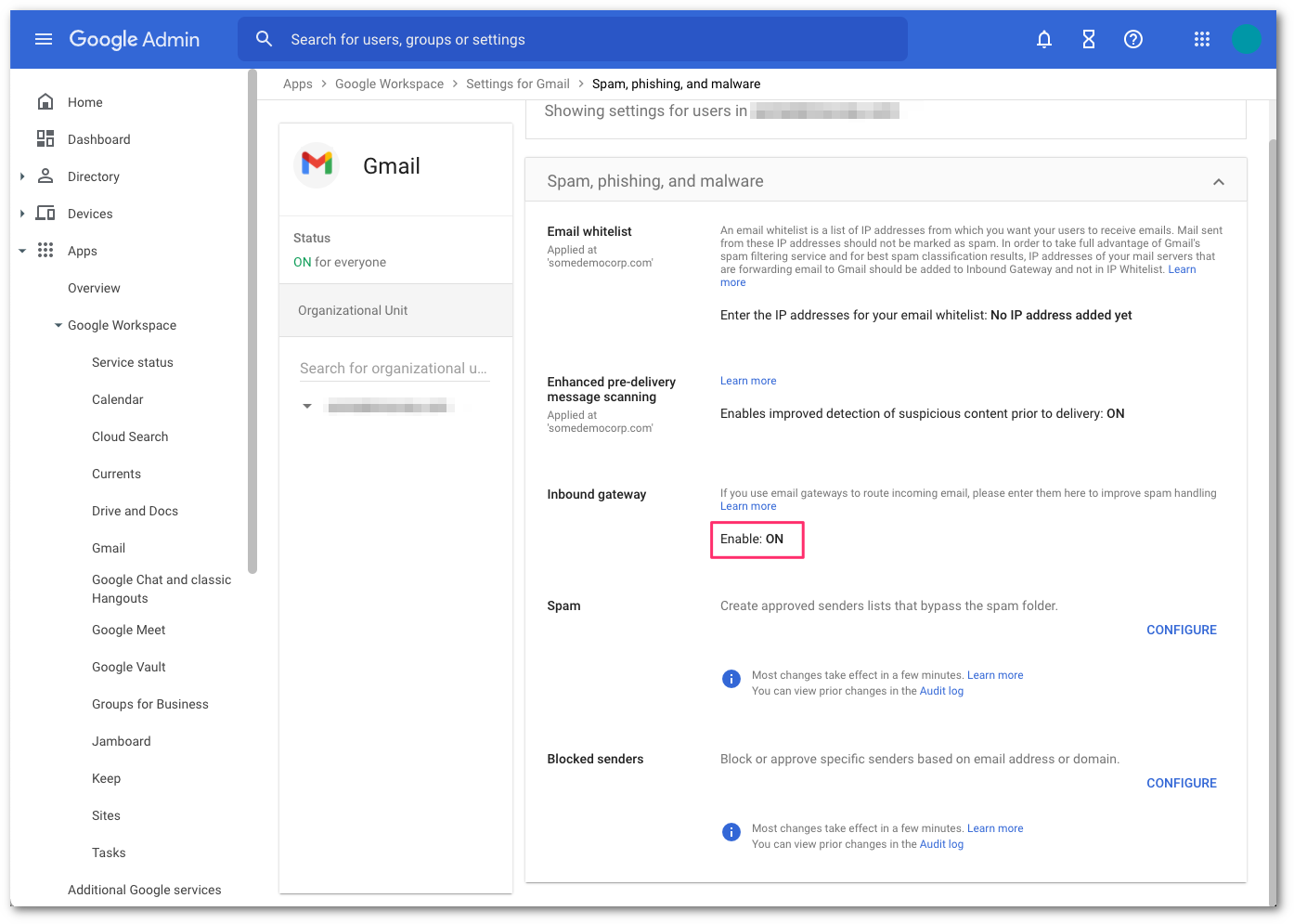 - Select Save once more to commit and activate the configuration change in the Gmail advanced configuration console.