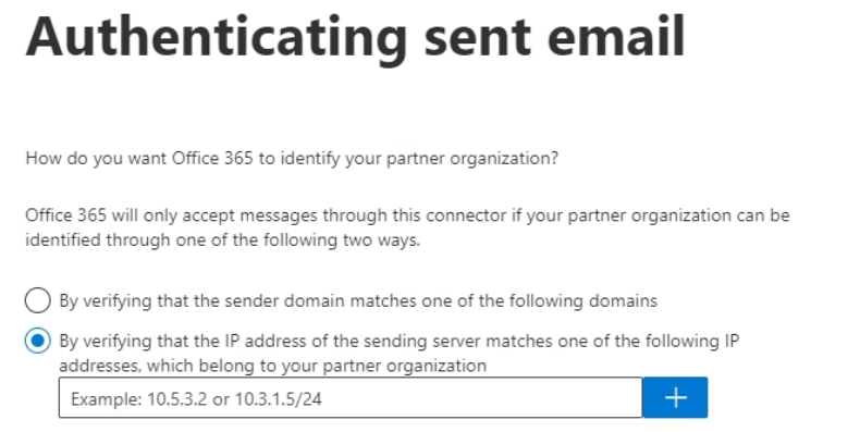 4. In Authenticating sent email, select By verifying that the IP address of the sending server matches one of the following IP addresses, which belongs to your partner organization. Enter all the of IPs listed here: Egress IPs.