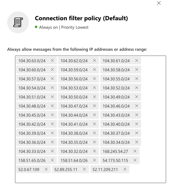 Please note that Microsoft does not allow CIDR blocks larger than a /24 to be entered. There are two Cloudflare CIDR blocks that are too large (104.30.32.0/19 and 134.195.26.0/23). On the Egress IPs page, these two block have been broken down in to /24 blocks that can be entered.