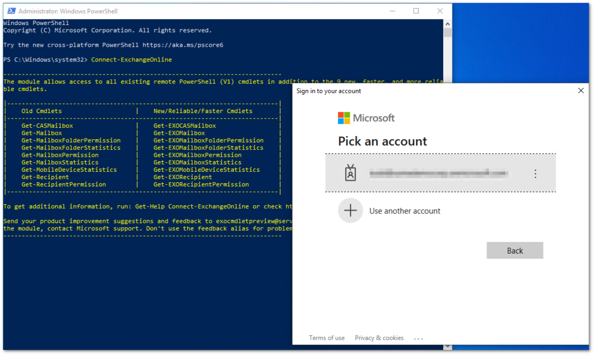 The Connect-ExchangeOnline cmdlet will prompt you to login. Please login using an O365 administrator account: