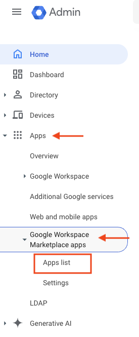 Log in to the Google Workspace Admin portal. In the left-hand menu, click Apps > Google Workspace Marketplace Apps > Apps List.