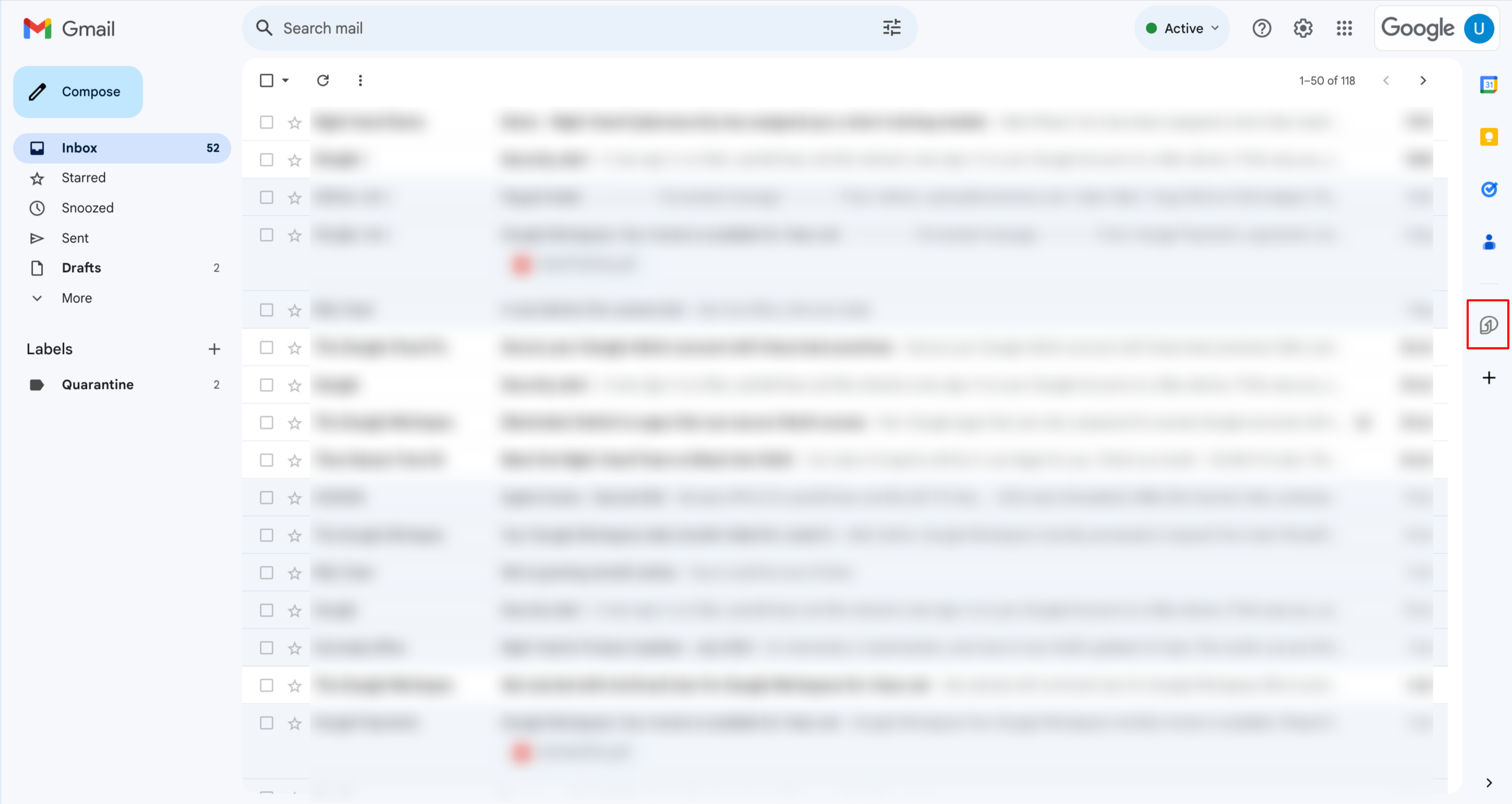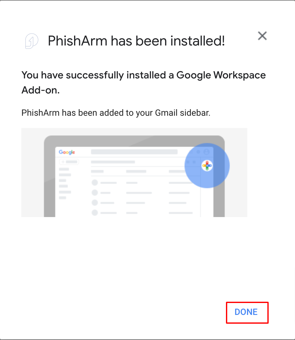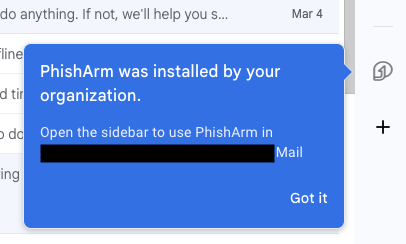 The PhishArm plug-in will be available for users in any browser, as well as in the Gmail mobile app. On the browser it appears on the right-hand side add-on panel (as shown below). In the Gmail Mobile app it appears when users open an email and scroll down to the bottom of the email.