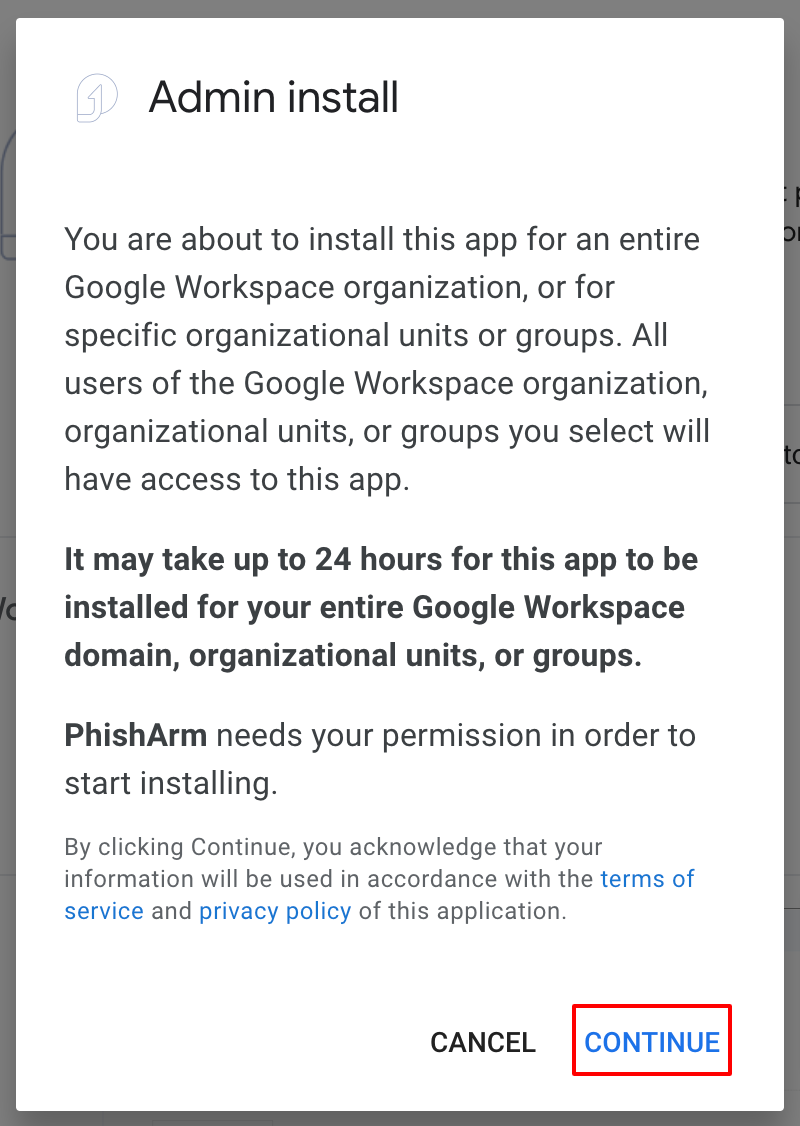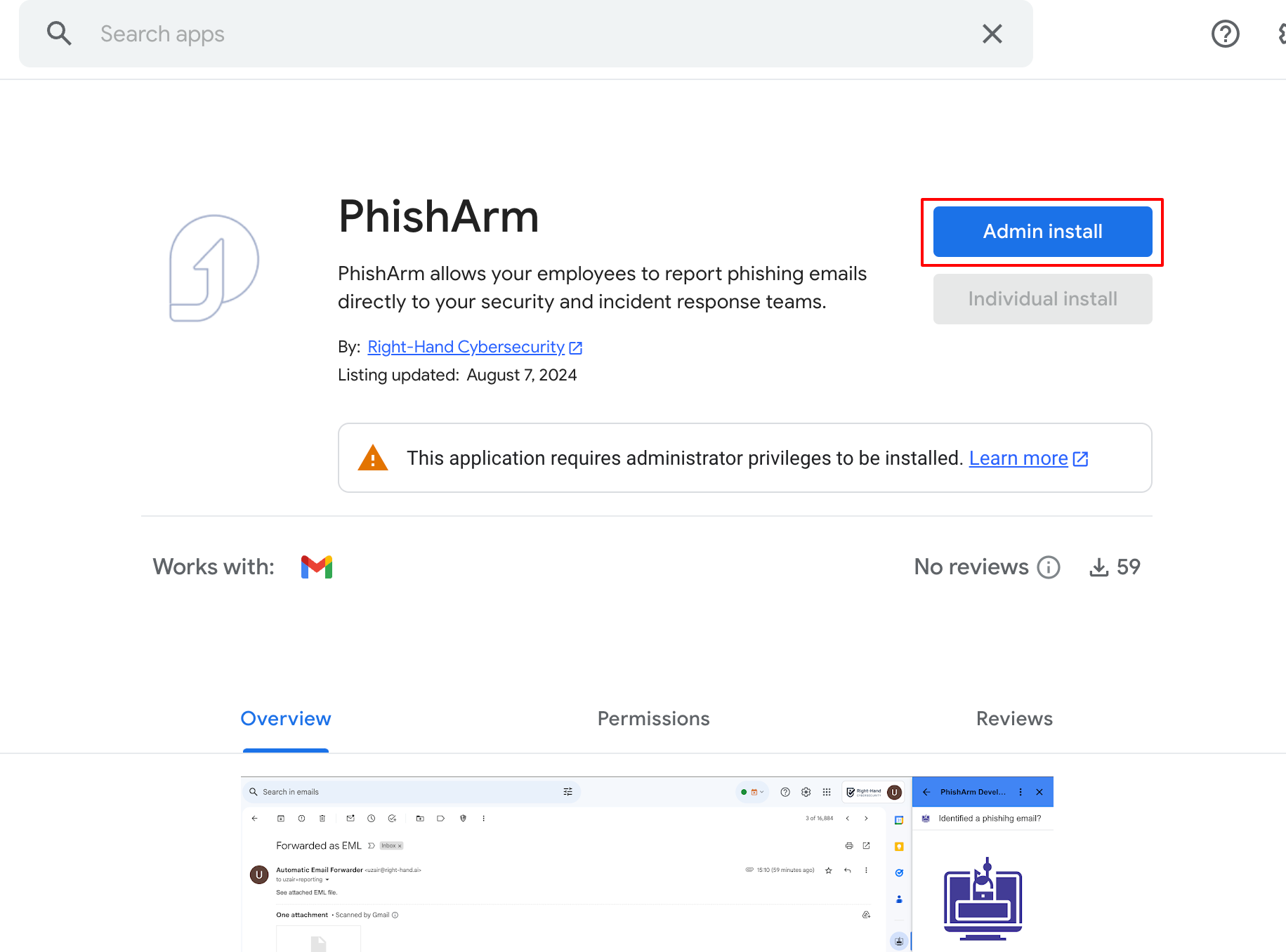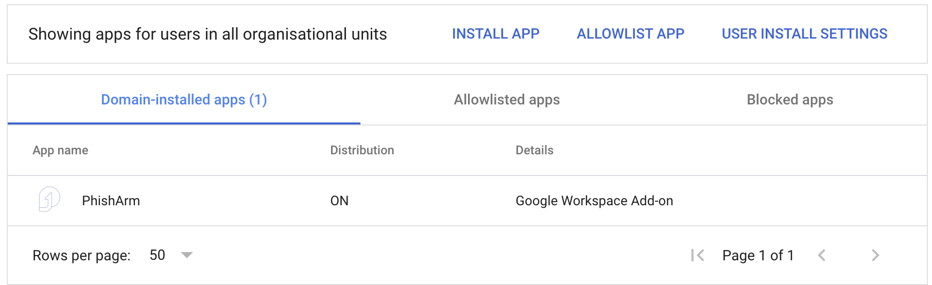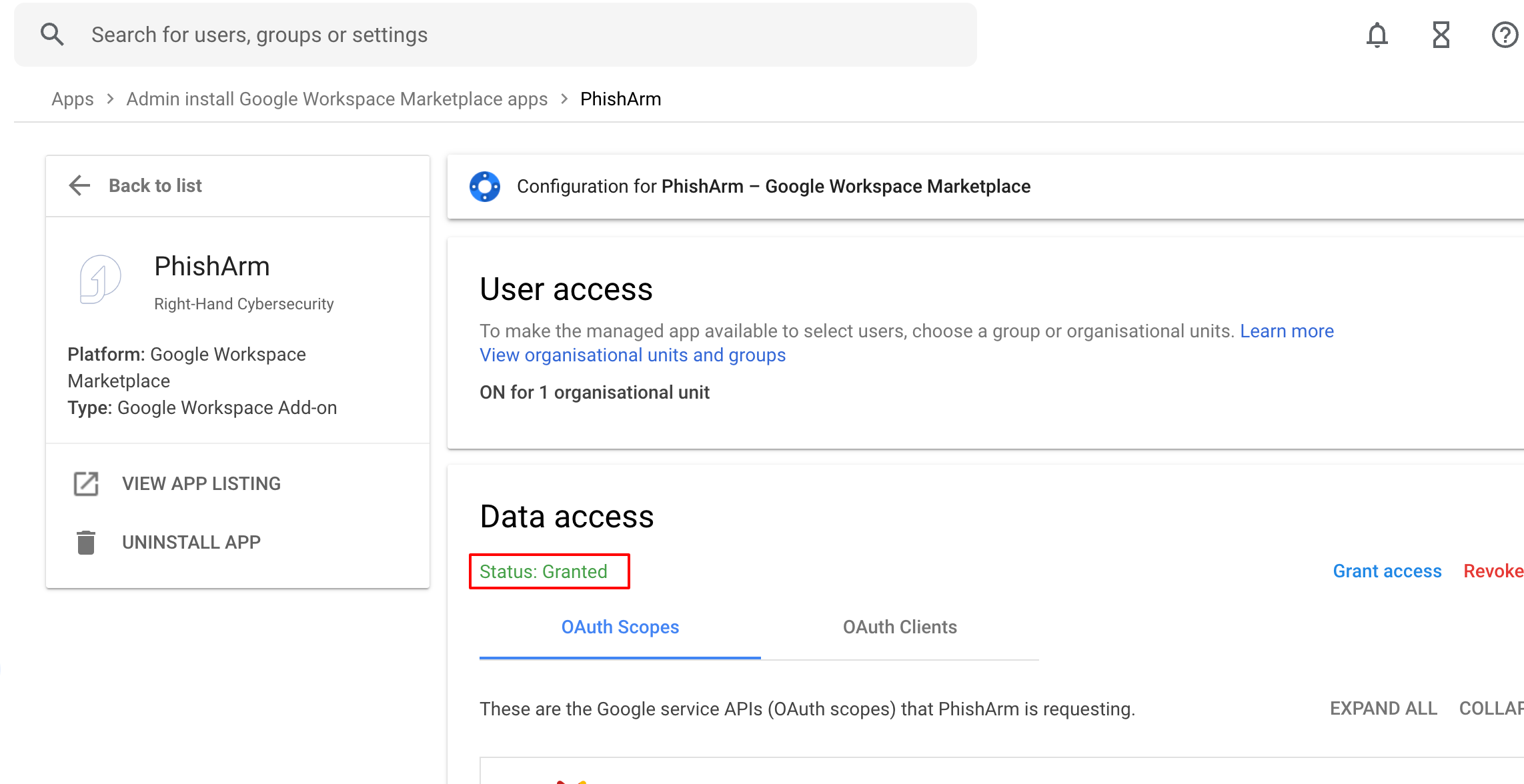 - Refresh the Apps page - you should see the PhishArm app in your Domain-installed apps section. Click on the PhishArm listing.