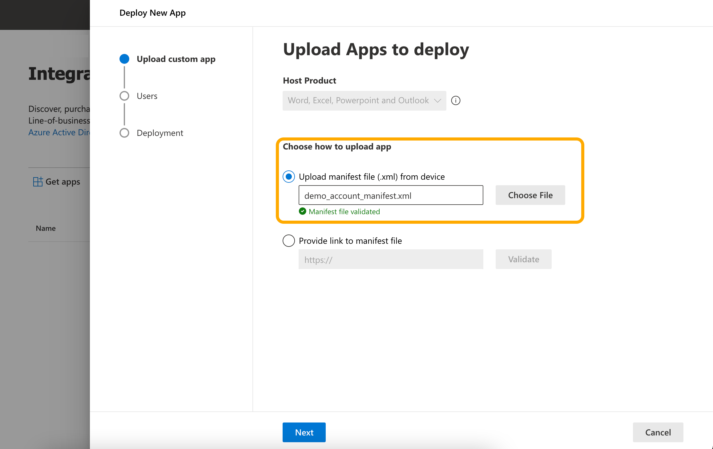 Under Deploy New App select Choose how to upload app Upload manifest File(.xml) provided to you by SolCyber.
