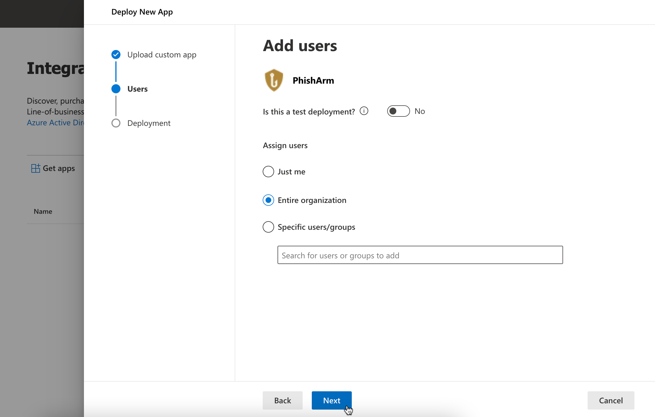 - Set Entire Organization (so that all employees under this domain will get this plugin in Outlook)