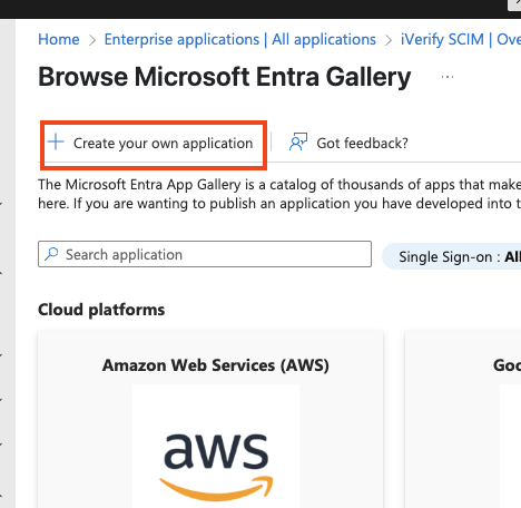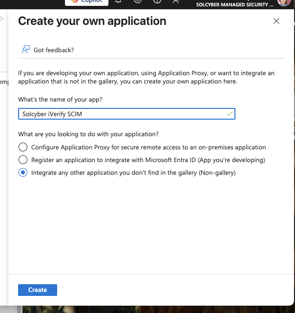 Use SolCyber iVerify SCIM as the name of the application. Select Integrate any other application (Non-gallery) and click Create.