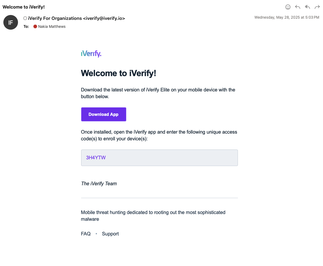 Provisioning is automatic and may take 20 - 40 minutes. Once the users are added to iVerify, they will receive an email with a an enrollment code. Please be sure to alert your users that this email will be coming to avoid any confusion. An example can be found below: