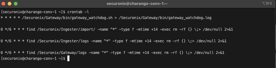 To avoid disk utilization issues in the future, let’s make sure we have the right scheduled tasks. Run the following commands as the securonix user:crontab -l