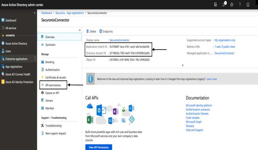 - Make a copy of Application (client ID) and Directory (tenant ID) for the application from the Application screen.