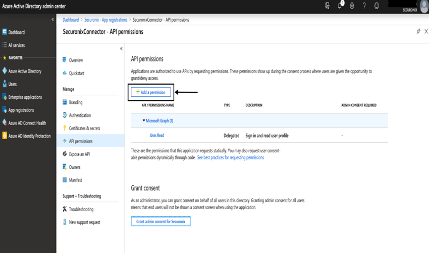 - Click Add a permission. A new Request API Permissions screen is displayed.