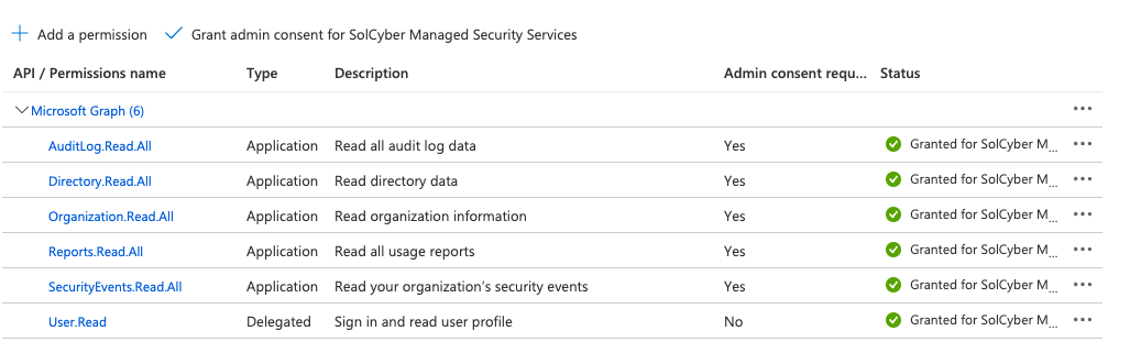 - Add the following APPLICATION permissions for Microsoft Graph: