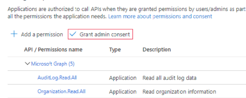 - Click Grant admin consent after selecting permission. For granting permissions, the user(s) with Global Administrator privileges are required.