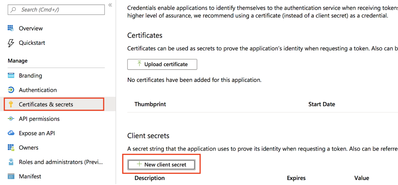 - Click the copy icon beside the Value of client secret to copy to clipboard. This value will not be retrievable once you leave this page.