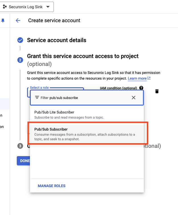 5. In the Grant this service account access to project, give the service account the “Pub/Sub Subscriber” role (you can search for “Pub/Sub Subscriber” to find the specific role. Click CONTINUE.