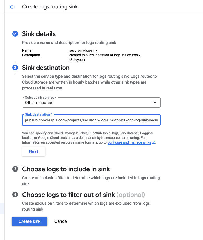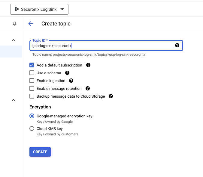 Example: pubsub.googleapis.com/projects/securonix-log-sink/topics/gcp-log-sink-securonix