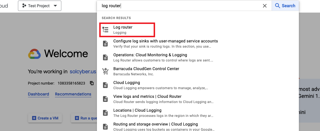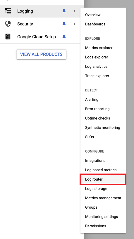 - Visit the Log Router service by going to Logging > Log router. You can also search for “Log router”.