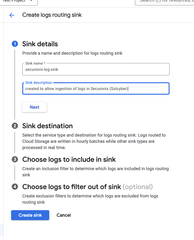 - Sink name: Provide an identifier for the sink; note that after you create the sink, you can’t rename the sink but you can delete it and create a new sink.