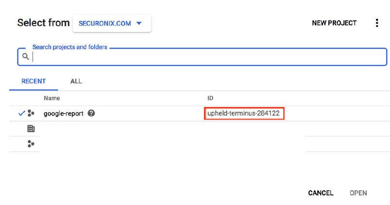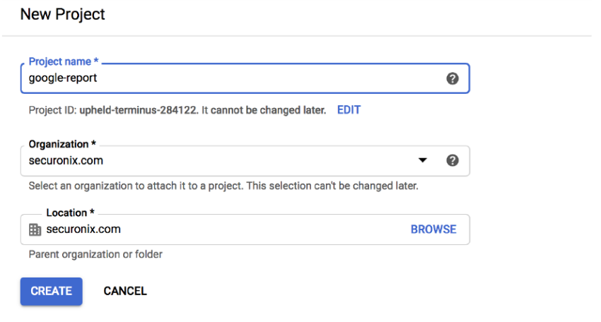 - Enter a project name (ex: “Securonix-Logs”), select the correct organization and location.