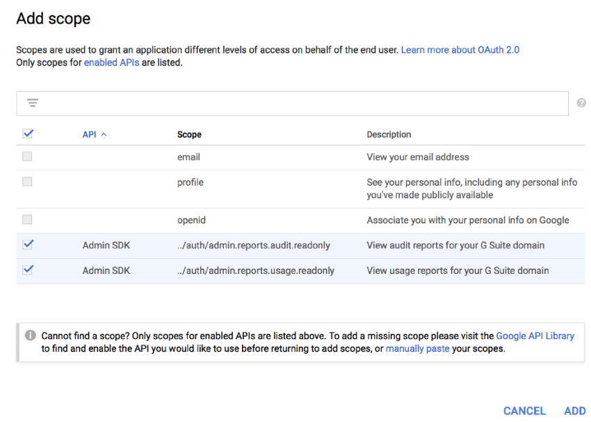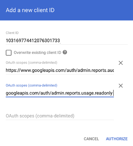- https://www.googleapis.com/auth/admin.reports.usage.readonly