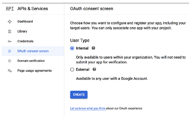 - Click OAuth consent screen from the left panel and select User type as Internal.