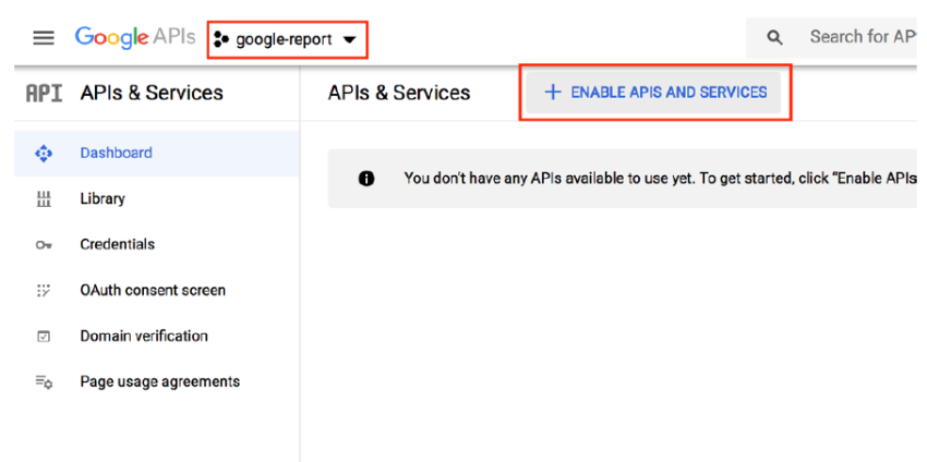 - Click Enable APIs and Services. The screen displays the new project ID.
